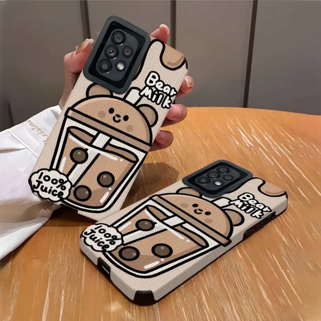 A charming phone accessory that features a cute bear sipping on refreshing juice. This playful design adds a burst of joy to your phone, combining adorable vibes with a touch of whimsy.
