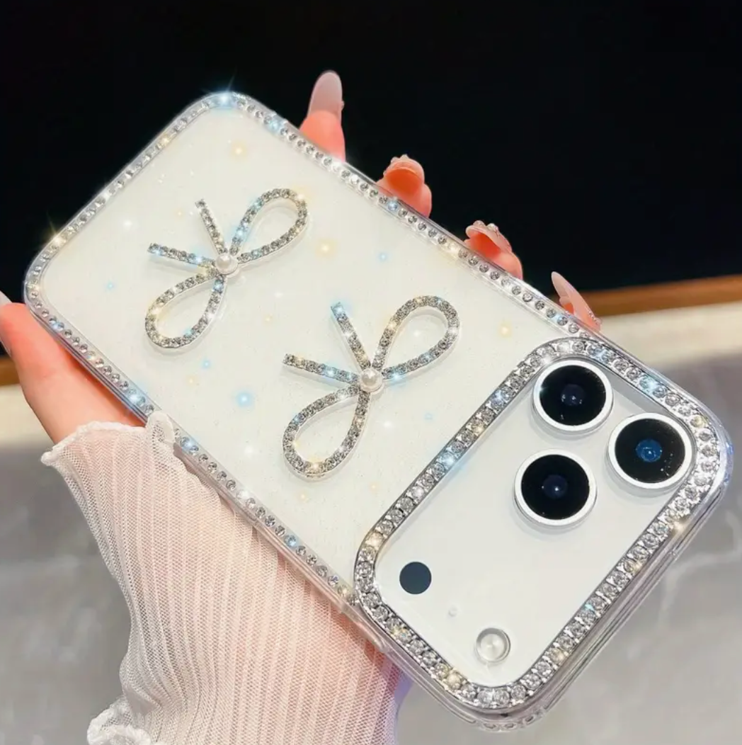 The Bling Bow case offers a charming blend of security and sparkle. It features a soft, glitter-infused back available in six pastel colors, instantly recognizable by its two 3D rhinestone bows with elegant pearl centers. For ultimate dazzle, the perimeter and camera module are fully lined with continuous rhinestone trim. Made from a durable, slim hybrid material, this case provides reliable shock-absorbent protection against drops and scratches while ensuring your phone looks impeccably chic.