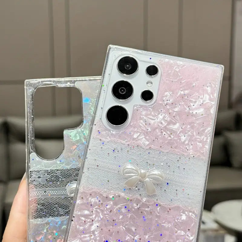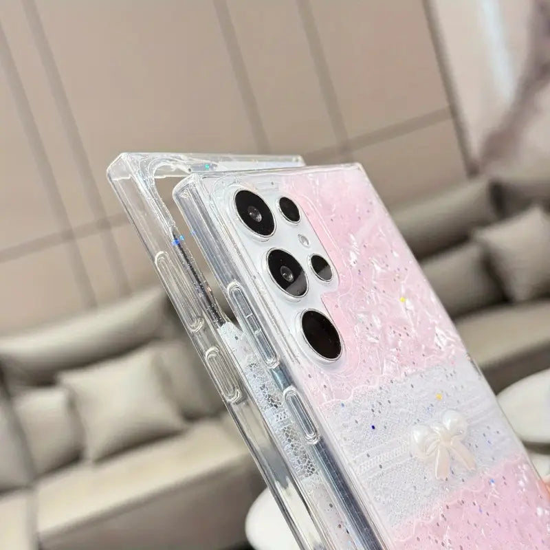 Add charm and sparkle to your Samsung device with the Bowknot Resin Glitter Protective Phone Case. Designed to combine style with functionality, this case features a delicate bowknot design surrounded by shimmering glitter, perfect for adding a touch of elegance to your everyday look.