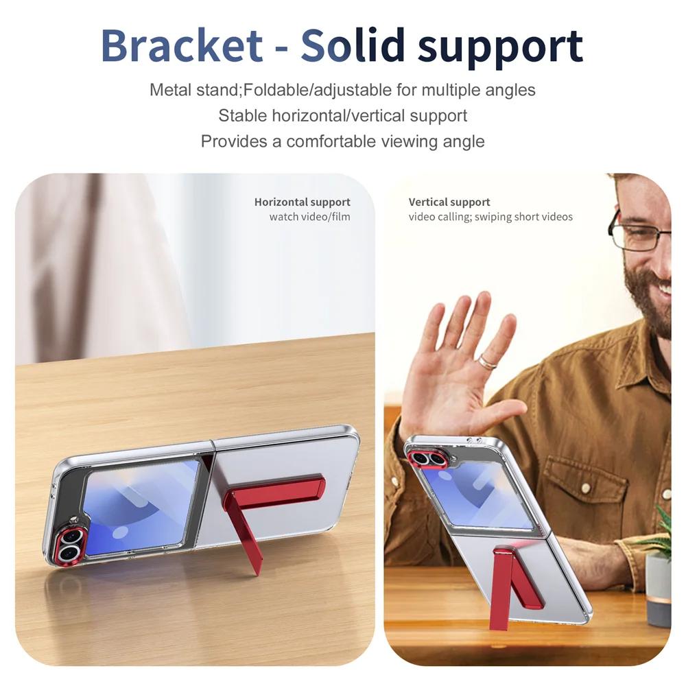 The Galaxy Z Flip6 Crystal Armor Case combines superior protection with sleek design, ensuring your device stays safeguarded while maintaining its stylish look. With a transparent back to showcase the original beauty of your phone, this shockproof case offers durability and resilience. Equipped with a sturdy metal kickstand for hands-free viewing, and a built-in screen protector to keep your display scratch-free, this case ensures 360° protection for your Galaxy Z Flip6. Perfect for those who want reliable defense without compromising on style.