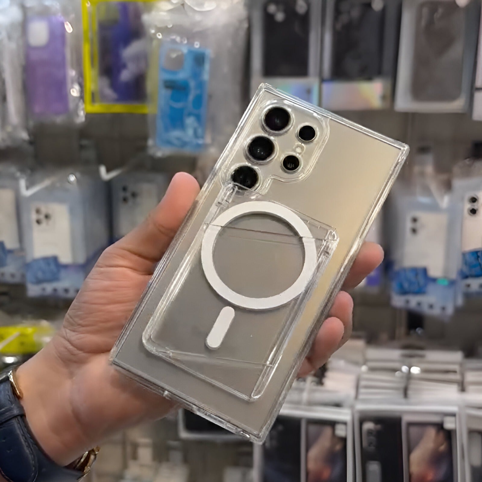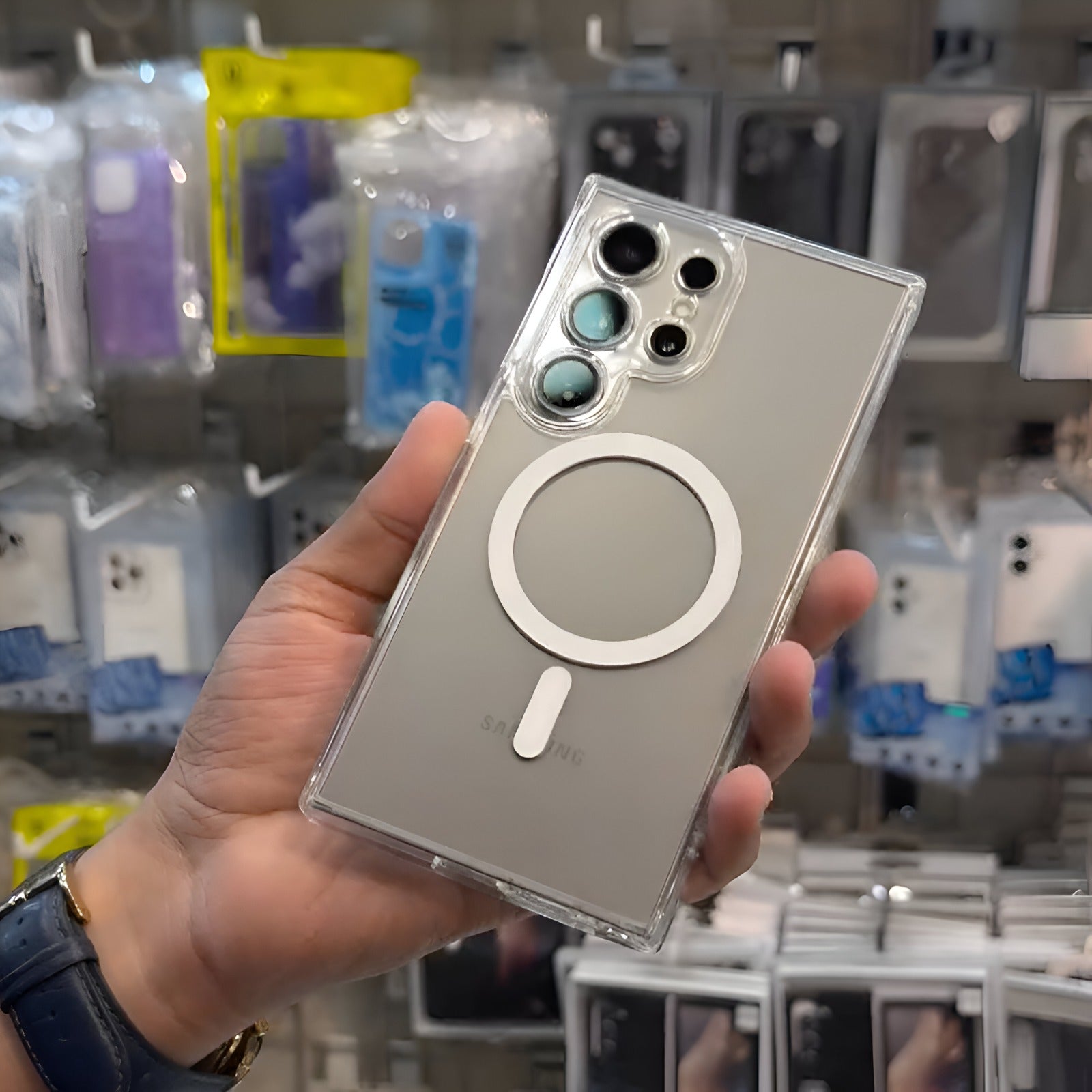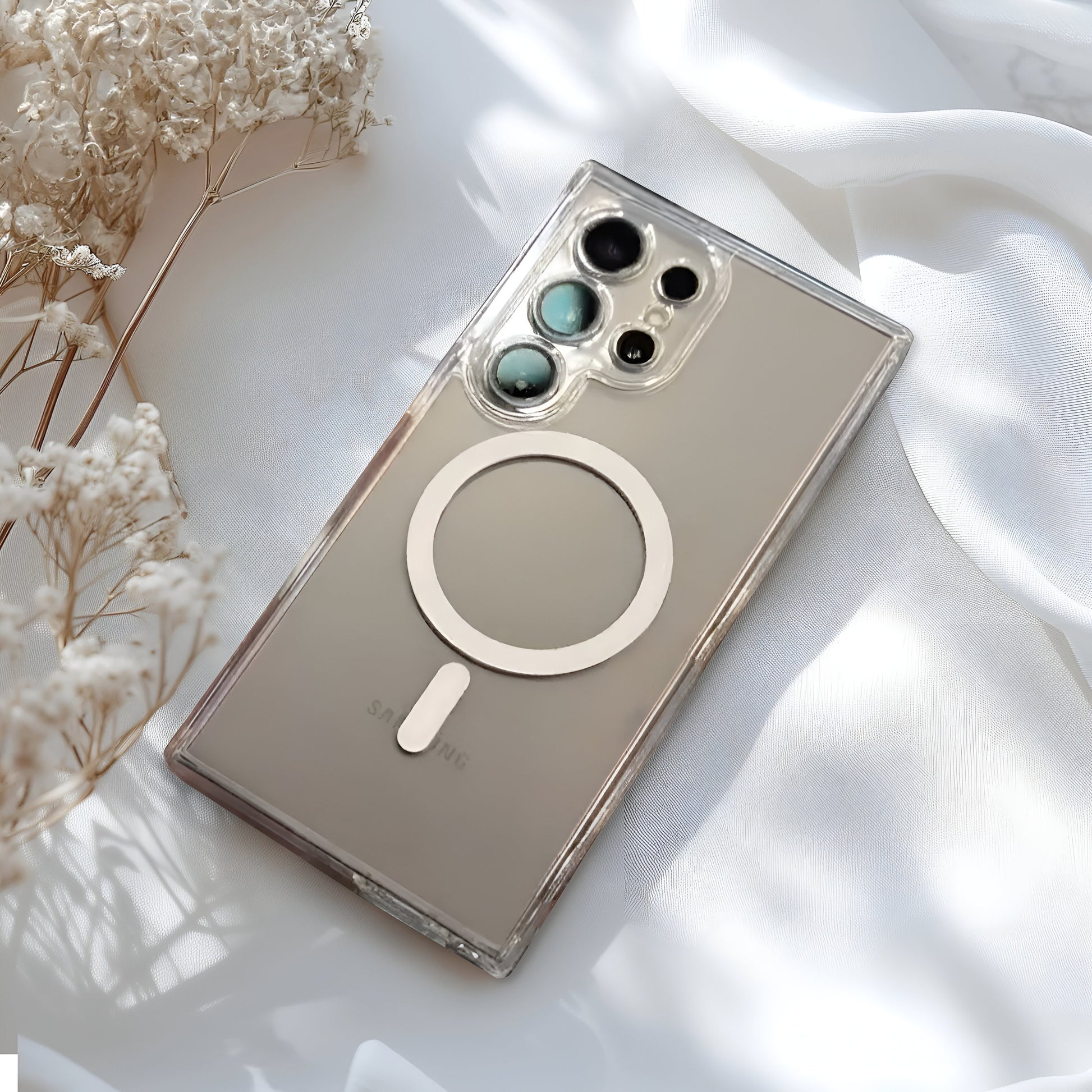 The Glide Guard Transparent MagSafe Case for Samsung combines sleek design with superior protection. This ultra-slim, transparent case features MagSafe compatibility for easy wireless charging and a built-in kickstand for hands-free viewing.