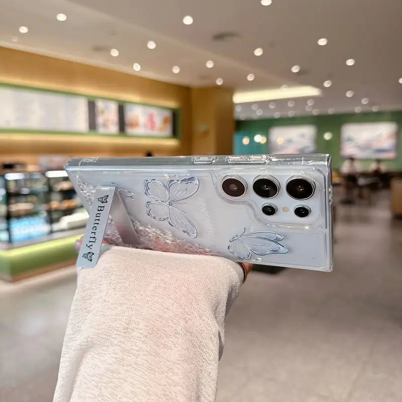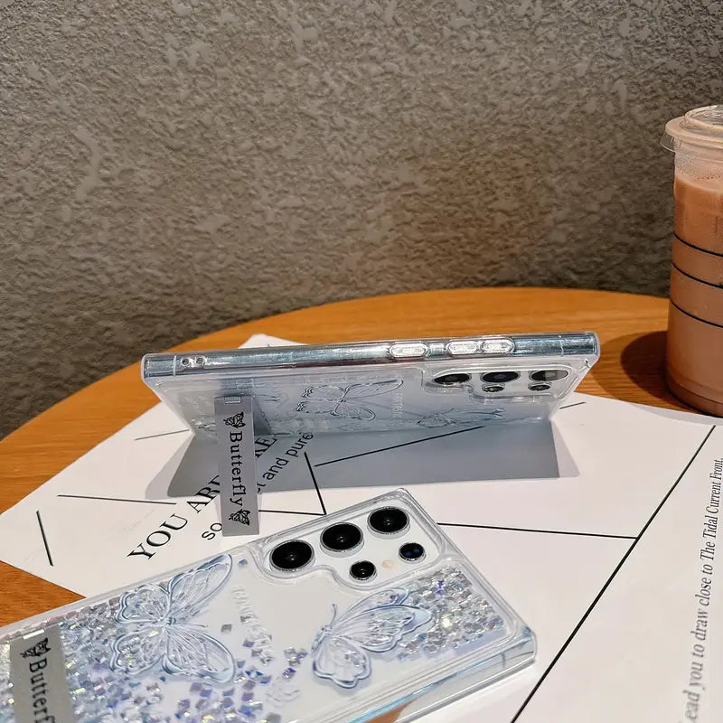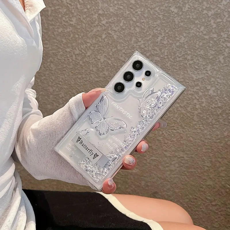 Add a touch of sparkle to your Samsung Galaxy with this stunning Glitter Butterfly Quicksand Phone Case. Designed to dazzle, this case features a mesmerizing liquid glitter effect with floating butterflies, creating a dynamic and eye-catching look. Not just stylish, it also offers excellent protection against scratches, bumps, and daily wear. The built-in bracket provides hands-free convenience for video watching or video calls, making it both fashionable and functional.