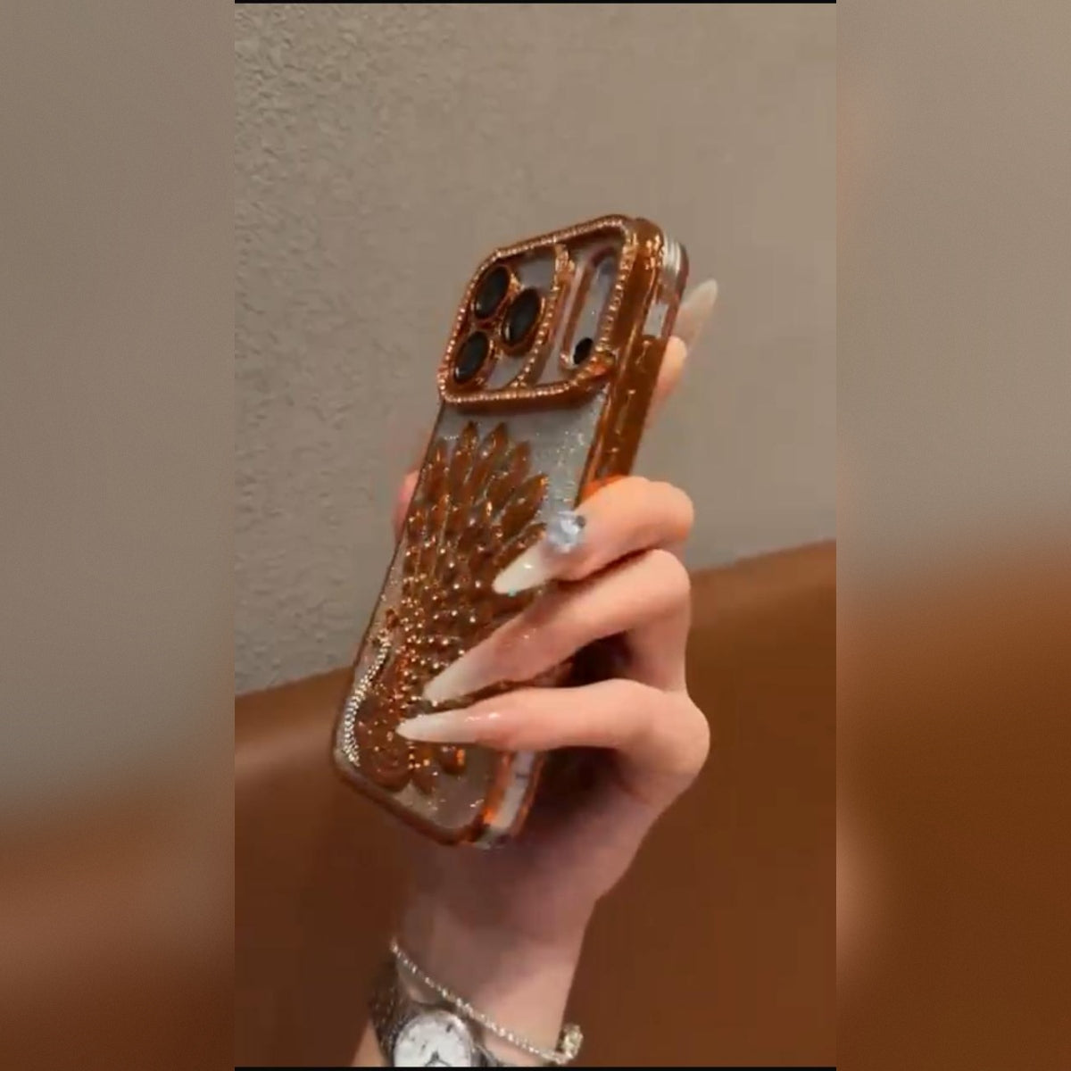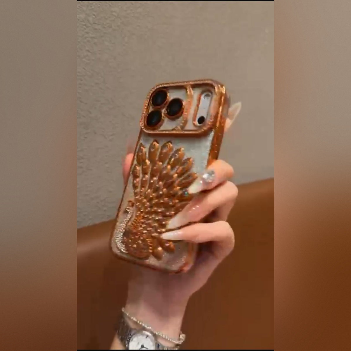 This dazzling phone case showcases a highly decorative style with an embossed metallic peacock motif in a warm, rose gold/copper tone. The peacock is set against a shimmering silver glitter background. The entire case, including the camera frame, is richly bordered with brilliant rhinestones for maximum sparkle and a luxurious, high-end finish. It's a true statement accessory.