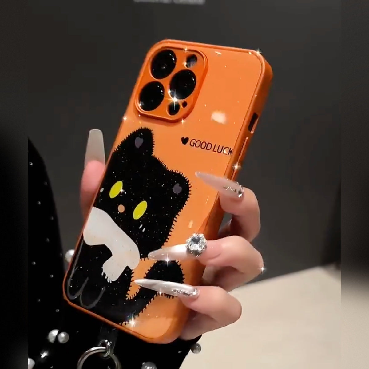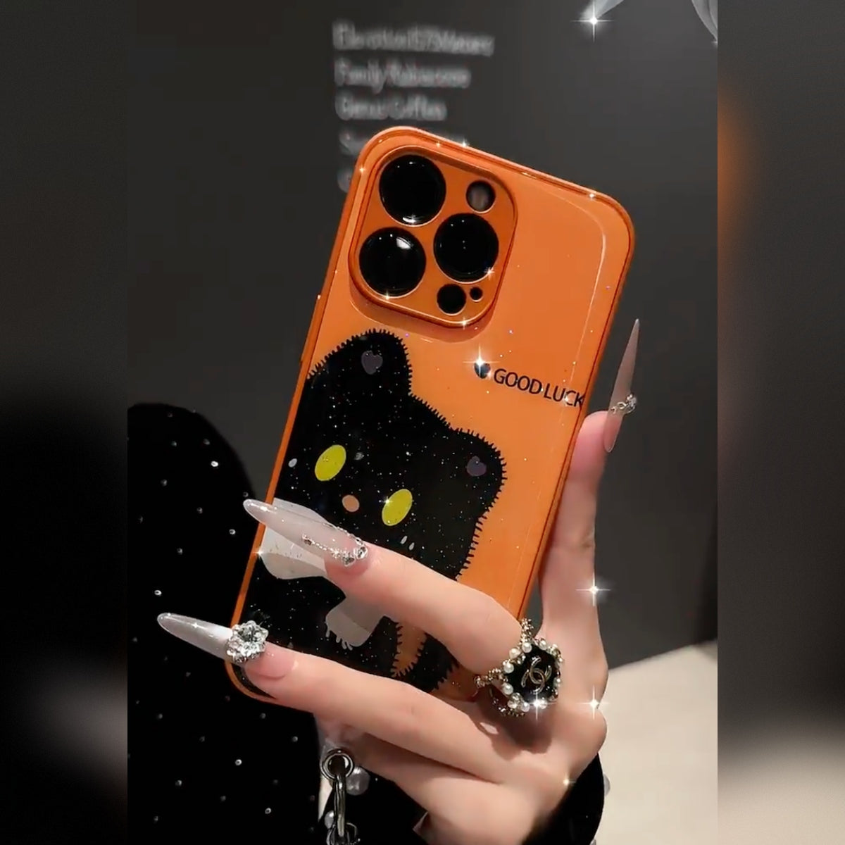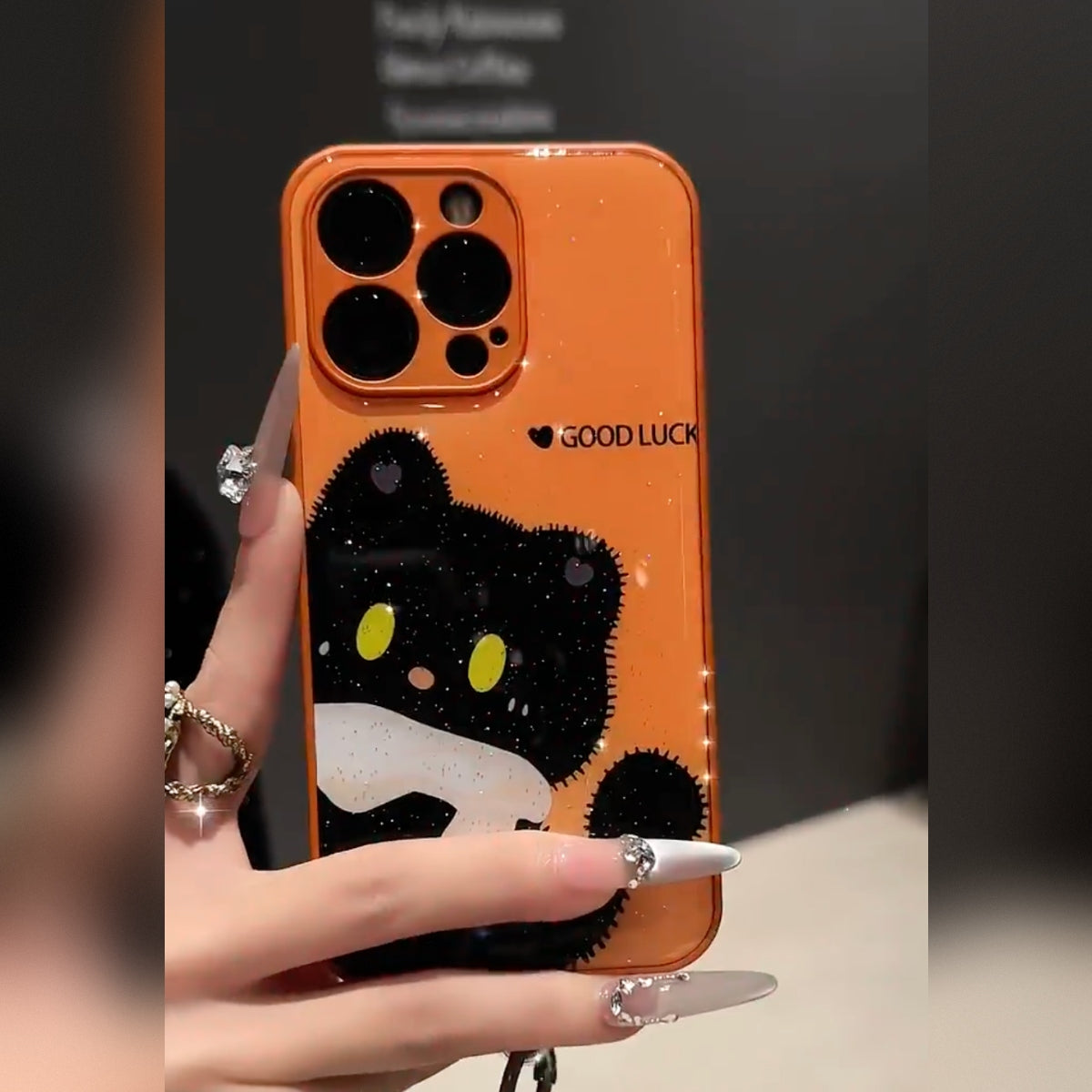 This Glow-Up Kitty Charm Case has a bold, playful, and high-glamour aesthetic. It features a vibrant, glossy orange back panel. The main design is a large black cat silhouette filled with dense black glitter, which sparkles intensely. The kitty has bright yellow eyes, adding a fun, animated look. The top section includes the optimistic message, "GOOD LUCK," and the camera module is framed by the matching orange case for raised protection.