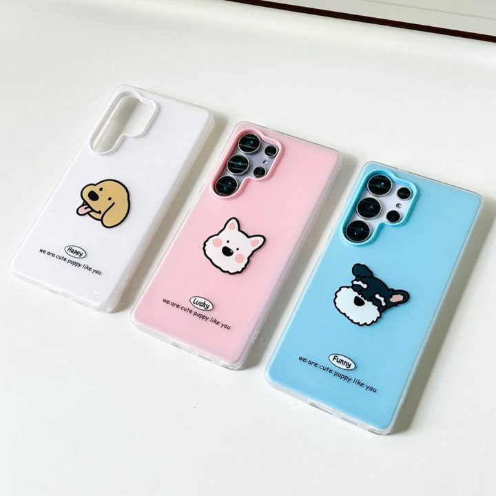 This set includes three simple, cute, and minimalist cases in Crisp White, Pastel Pink, and Baby Blue. Each case is made from smooth, soft-touch TPU/Silicone for a comfortable grip and lightweight protection. The design centers on a raised 3D puppy head decal corresponding to the base color. Below the graphic, the sweet message "we are cute puppy like you" is printed, accented by a thematic word like "Happy," "Lucky," or "Funny". A raised bezel around the camera provides essential lens protection.