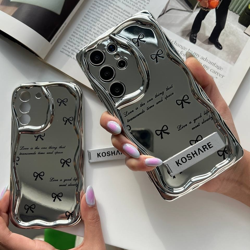 Bring a blend of modern elegance and playful charm to your phone with the Modern Wave Frame Case with Bow Pattern. Featuring a sleek mirror-like finish and a wavy frame design, this case exudes sophistication while offering a unique look.