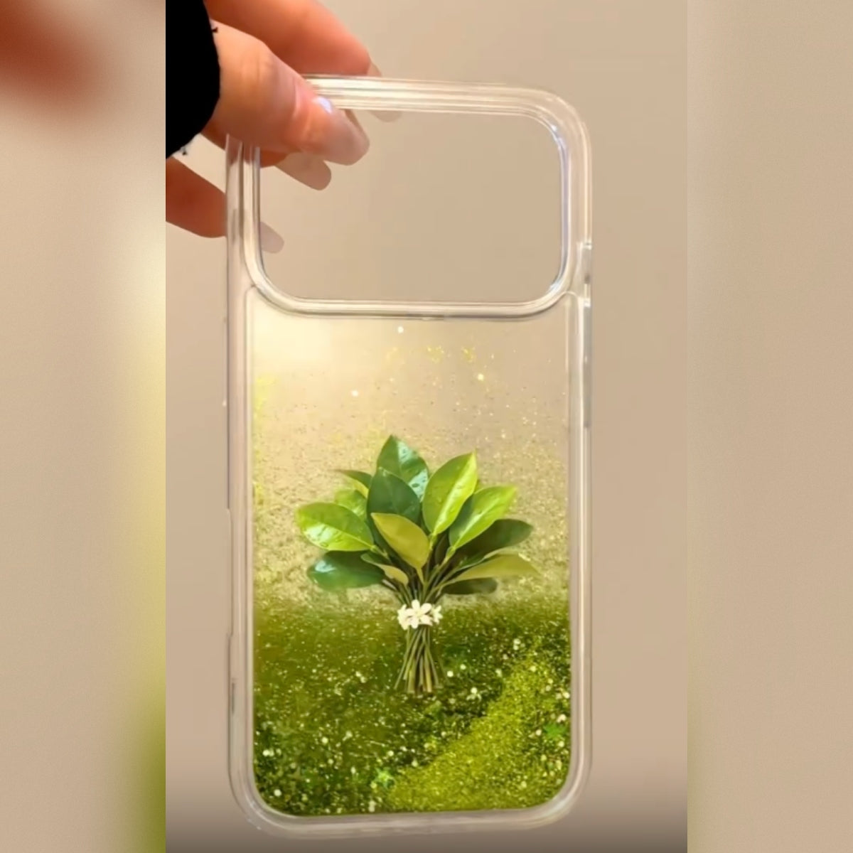 This Nature Sparkle Case offers a unique, dynamic, and enchanting aesthetic. It is a clear liquid glitter case featuring a captivating flow of green and gold glitter that creates a waterfall effect. The defining feature is the real preserved miniature bouquet of green leaves artfully placed inside the liquid. The case is finished with a clear, protective TPU frame and a raised camera bezel.