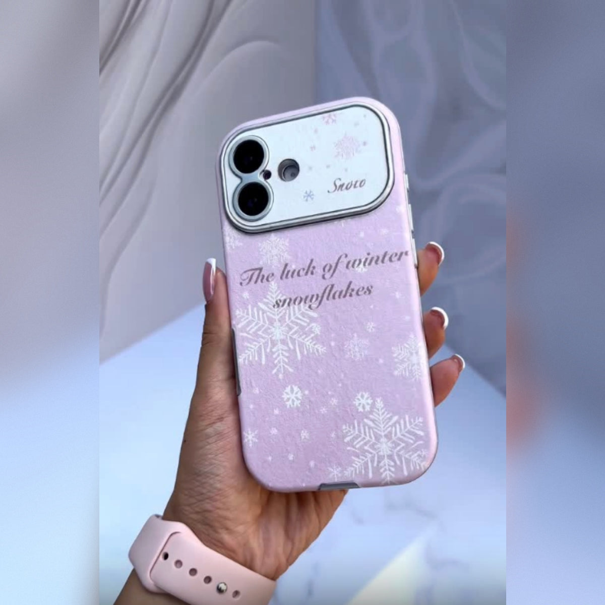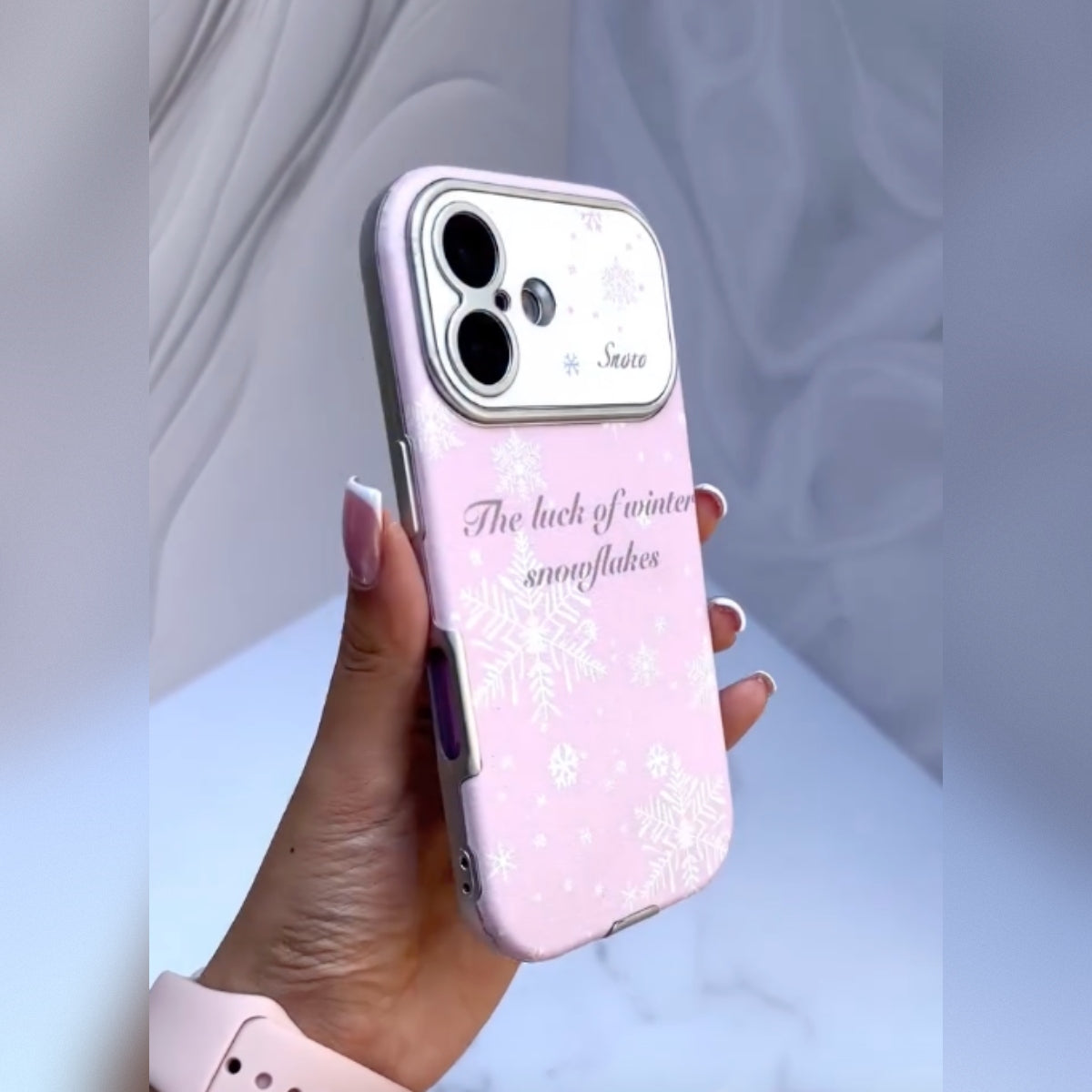 This Pastel Pink Snowflake Case offers a minimalist, chic, and seasonal winter aesthetic. The body has a soft, matte pastel pink finish with crisp white snowflake prints. The prominent message, "The luck of winter snowflakes," adds charm. A contrasting white panel frames the camera and features the word "Snow," providing raised, robust protection for the lenses.