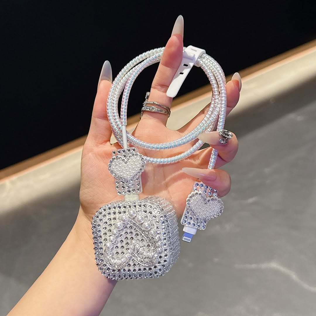 Elevate your tech accessories with the Pearl Luxe Adapter Kit with Crystals, the ultimate blend of elegance and functionality. Featuring a stunning design adorned with pearls and sparkling crystals.