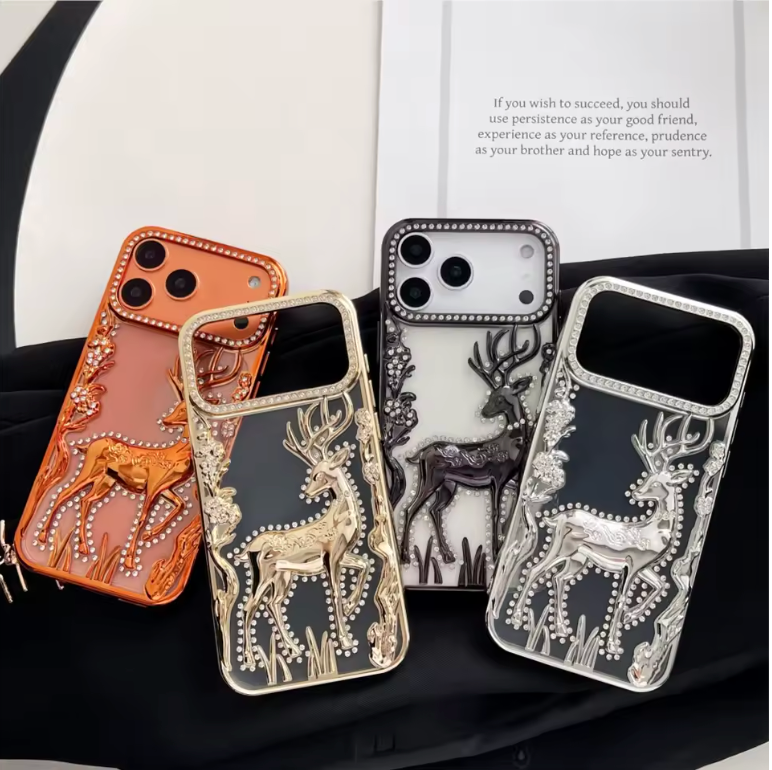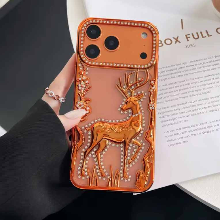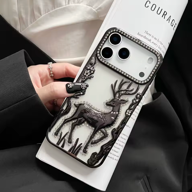 - Embellishment: Heavy rhinestone detailing along the edges, camera module, and around the deer.