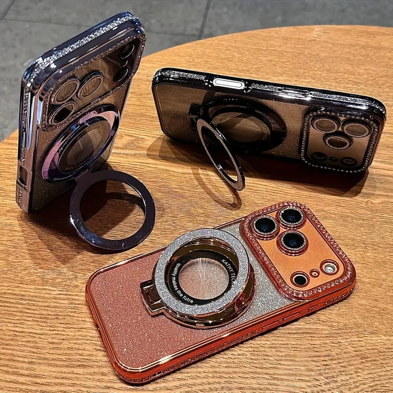 This Regal Sparkle Ring Case combines dazzling glamour with multi-functional utility. The case features a back panel covered in intense, dense metallic glitter. The aesthetic is maximized by brilliant rhinestones heavily decorating the camera module and outer edges. The standout feature is the integrated rotating ring holder, which is centrally placed and also accented with glitter. This ring functions as a secure grip, kickstand, and a decorative element, offering convenience and luxury.