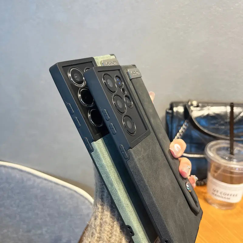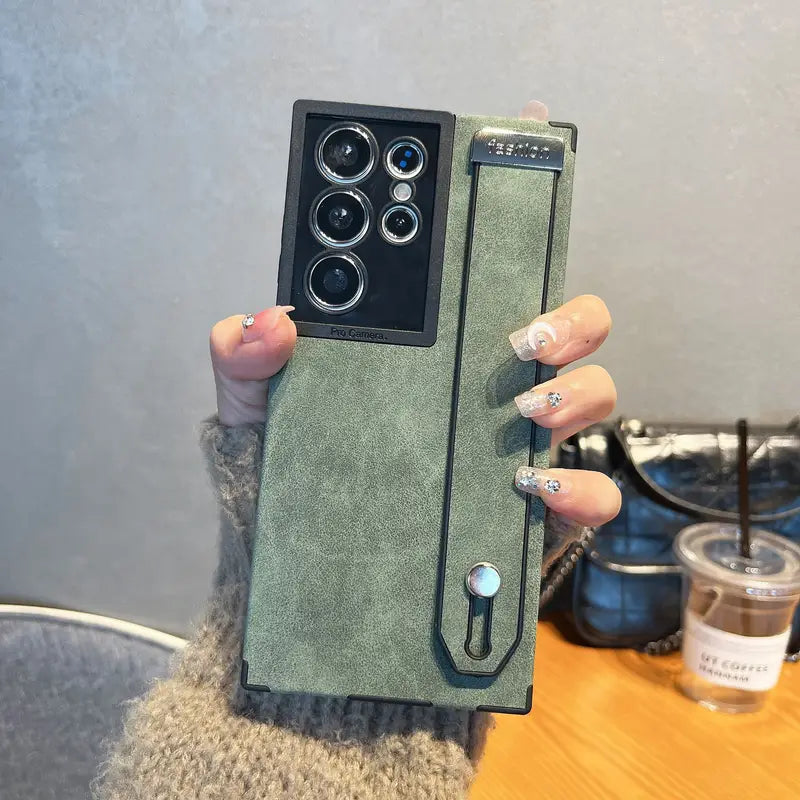 The Retro Monochrome Phone Case features a simple artificial leather texture with a built-in wristband and holder, blending style and functionality for your Samsung device.