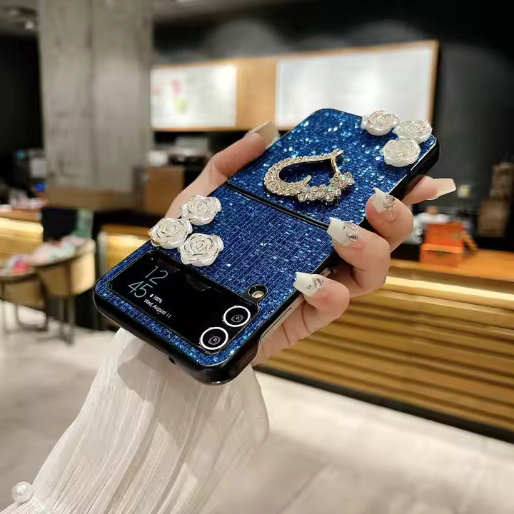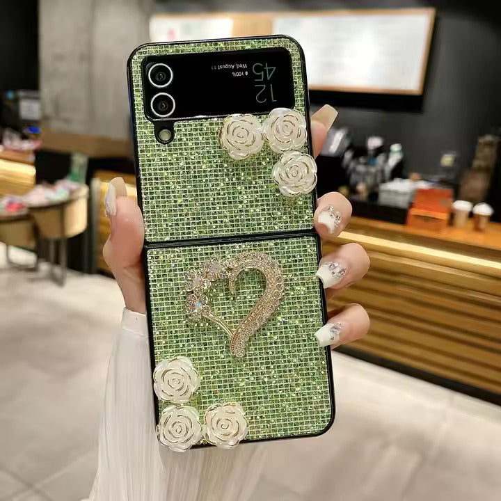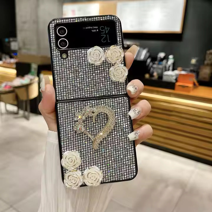 This stylish phone case combines elegance and protection with its glittery heart and flower design. Tailored for Samsung Galaxy Z Flip 5 and Z Flip 6 models, it adds a vibrant sparkle while ensuring durability. The hard PC material provides shockproof features for full device protection.