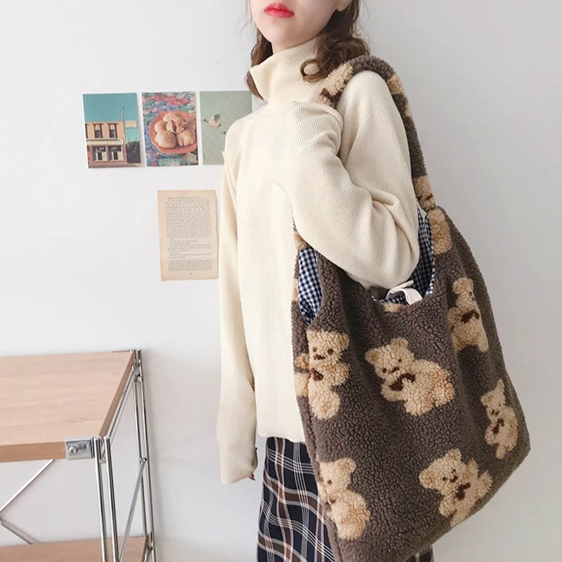 Indulge in cozy elegance with our Plush Shoulder Bag. Crafted from warm cloth fabric, this soft canvas tote boasts a large capacity, perfect for all your shopping needs. Adorned with a cute bear design, it's the ultimate combination of style, comfort, and practicality for the modern lady on the go.