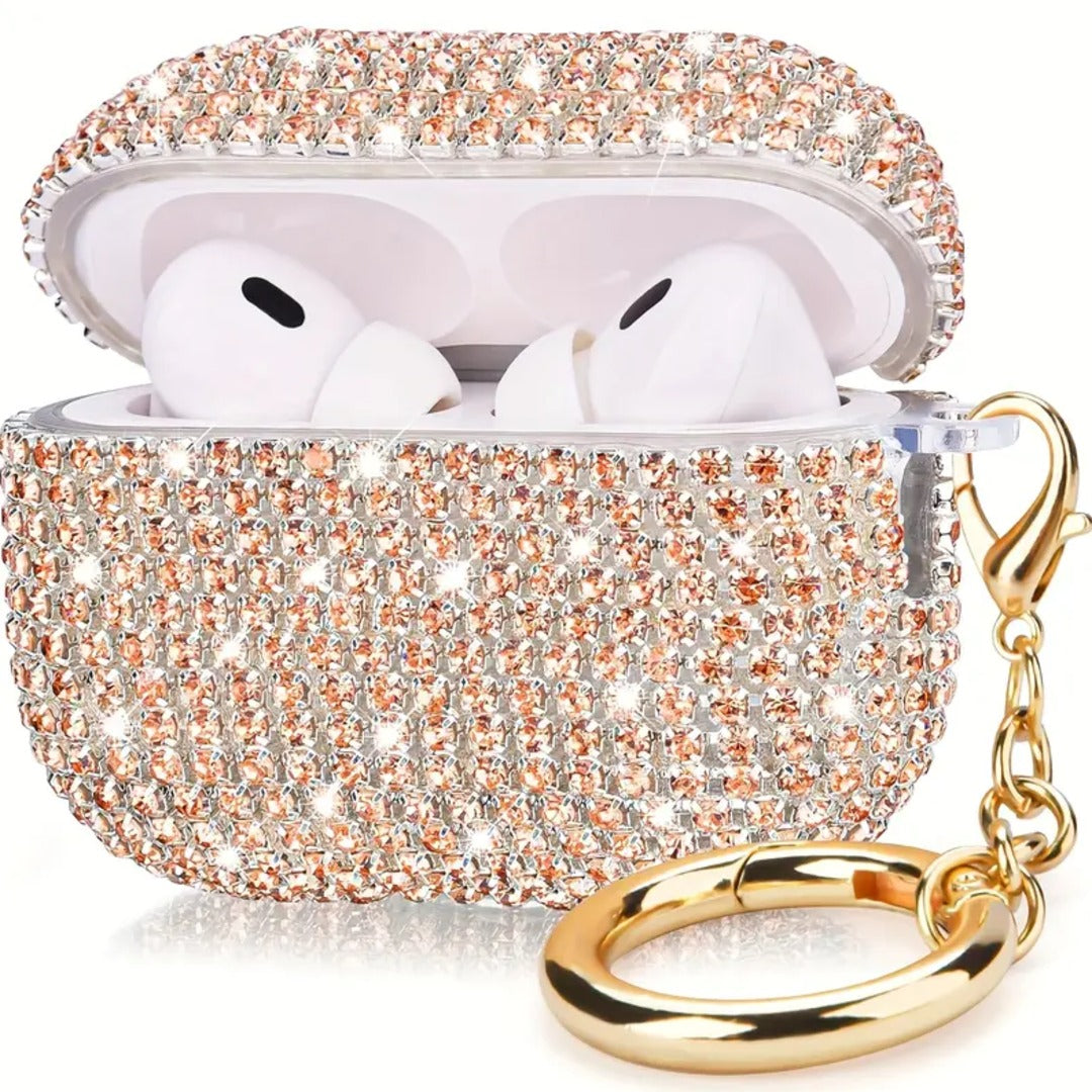 Add a touch of luxury to your everyday essentials with the Sparkling Crystal AirPods Case with Gold Keychain. This dazzling case is adorned with premium rhinestones that shimmer beautifully, creating a glamorous and eye-catching look.